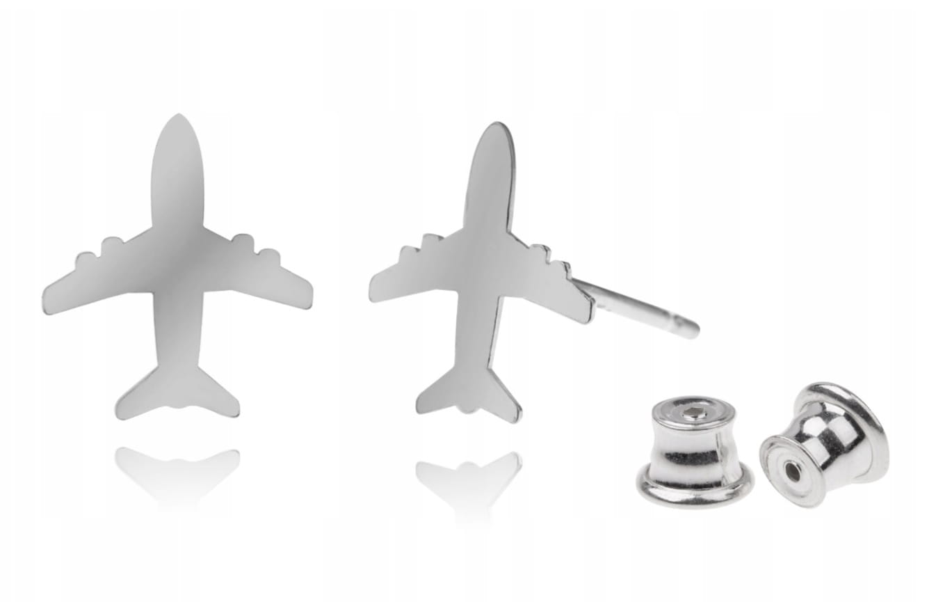 Piękne kolczyki - wkręty dla fanki lotnictwa. Samolot ma wymiar 1,0 x 1,1 cm, wykonane ze srebra próby 925.